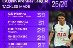 本赛季英超抢断榜:帕利尼亚压米切尔居首,廷伯、凯塞多列前四